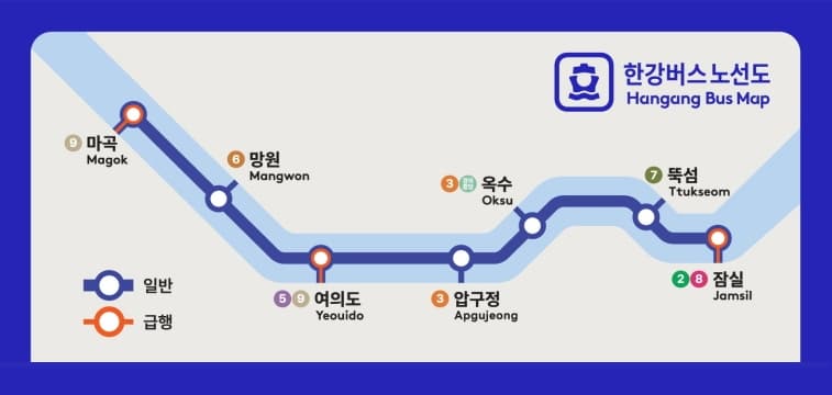 • 운항 노선 :마곡 ↔ 망원 ↔ 여의도 ↔ 압구정 ↔ 옥수 ↔ 뚝섬 ↔ 잠실